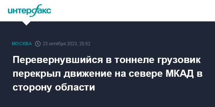Москва. 23 октября. INTERFAX.RU - Движение в сторону Московской области перекрыто из-за перевернувшегося в тоннеле грузовика в районе развязки МКАД и Дмитровского шоссе. Об этом сообщили в понедельник в пресс-службе столичного департамента транспорта.