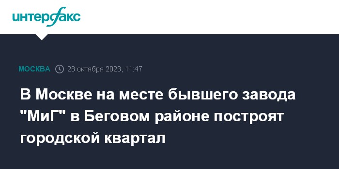 В Москве на месте бывшего завода "МиГ" в Беговом районе построят городской квартал