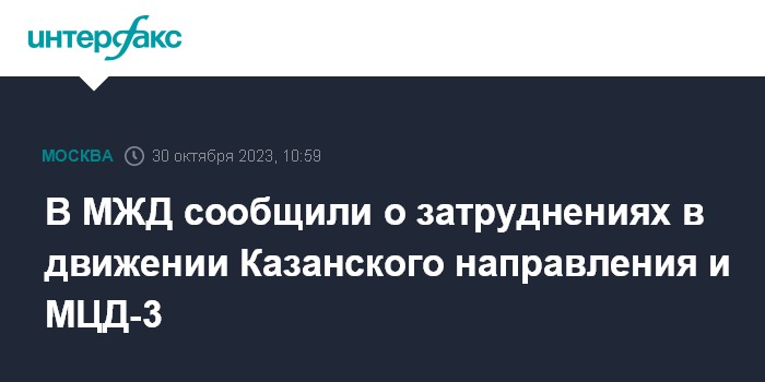 Москва. 30 октября. INTERFAX.RU - Движение поездов Казанского направления Московской железной дороги в сторону Москвы, а также поездов третьей линии Московских центральных диметров (МЦД-3) в сторону Крюкова затруднено утром в понедельник.