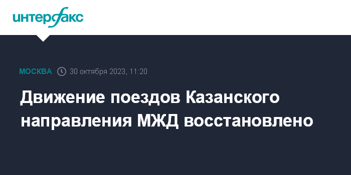 Москва. 30 октября. INTERFAX.RU - На Казанском направлении Московской железной дороги восстановлено движение поездов на участке Быково-Люберцы, сообщил телеграм-канал МЖД.