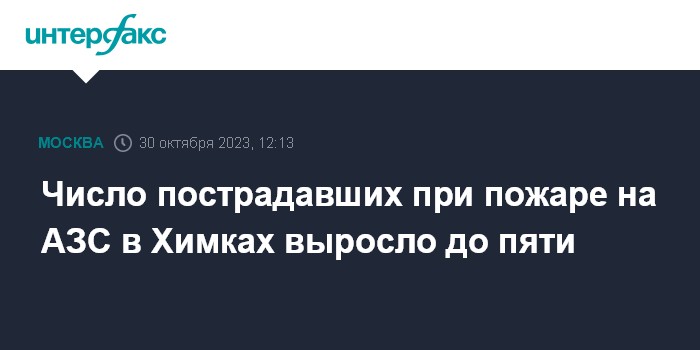Москва. 30 октября. INTERFAX.RU - По уточненным данным, при пожаре на АЗС в Химках пострадали пять человек, а не три, как сообщалось ранее. Об этом сообщила пресс-служба федерального МЧС.