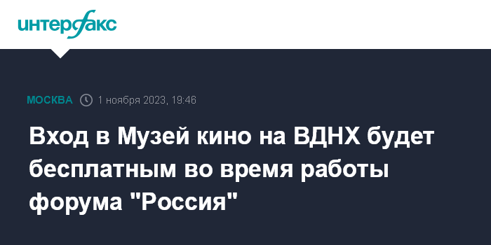 Москва. 1 ноября. INTERFAX.RU - Музей кино на ВДНХ сделает бесплатным вход на постоянную экспозицию и выставки во время работы международной выставки-форума "Россия".