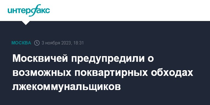 Москва. 3 ноября. INTERFAX.RU - В Москве в ближайшие выходные могут активизироваться мошенники и под видом сотрудников коммунальных служб проводить поквартирные обходы, предупредил заммэра города Петр Бирюков через телеграм-канал комплекса городского хозяйства.