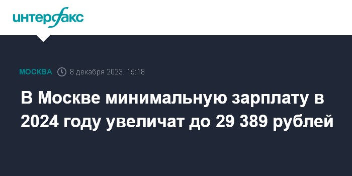 Москва. 8 декабря. INTERFAX.RU - Правительство Москвы утвердило размер минимальной заработной платы в Москве в 2024 году, он будет увеличен на 18,5% и достигнет 29 389 рублей, сообщил через пресс-службу заммэра города по вопросам экономической политики и имущественно-земельных отношений Владимир Ефимов.