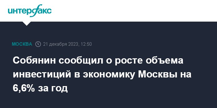 Москва. 21 декабря. INTERFAX.RU - Объем инвестиций в экономику Москвы составил почти 4 трлн рублей за 9 месяцев 2023 года, это на 6,6% больше, чем за такой же период годом ранее, сообщил в Telegram мэр столицы Сергей Собянин.