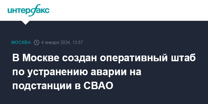 Москва. 4 января. INTERFAX.RU - В столице после пожара на трансформаторной подстанции на северо-востоке создан оперативный штаб, сообщил в четверг мэр Москвы Сергей Собянин.