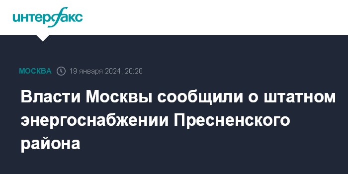 Москва. 19 января. INTERFAX.RU - Энергоснабжение всех потребителей в Пресненском районе в центре столицы работает штатно, сообщает комплекс городского хозяйства Москвы в пятницу в своем телеграм-канале.