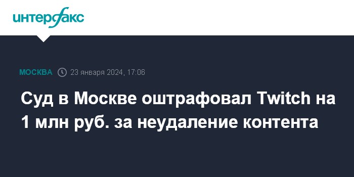 Москва. 23 января. INTERFAX.RU - Таганский суд Москвы назначил штраф в 1 млн рублей видеосервису Twitch за неудаление контента, доступ к которому подлежит ограничению, сообщили "Интерфаксу" в суде во вторник.