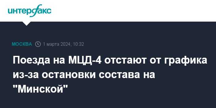 Москва. 1 марта. INTERFAX.RU - Поезда на четвертой линии Московских центральных диаметров (МЦД-4) следуют с отклонением от графика, сообщили "Интерфаксу" в пресс-службе Московской железной дороги (МЖД).