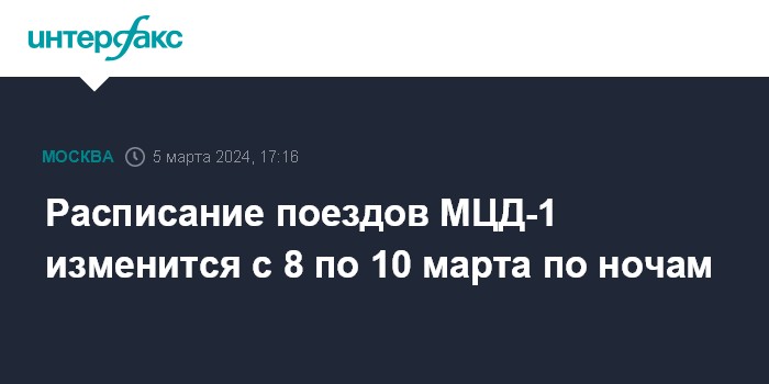 Москва. 5 марта. INTERFAX.RU - Расписание поездов на Савеловском и Белорусском направлениях первой линии Московских центральных диаметров (МЦД-1, D1) изменится 8-10 марта в ночные часы из-за строительства путепроводной развязки между станциями "Беговая" и "Тестовская", сообщил Департамент транспорта Москвы.