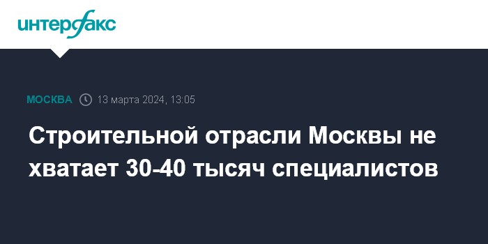 Москва. 13 марта. INTERFAX.RU - Сейчас на стройках Москвы работает от 400 до 600 тысяч человек, в целом в отрасли занято около 1 млн специалистов, сообщил журналистам заммэра столицы по вопросам градостроительной политики и строительства Андрей Бочкарев. Он добавил, что сейчас отмечается нехватка еще 30-40 тысяч специалистов.