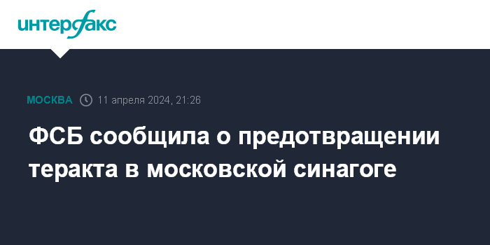 Москва. 11 апреля. INTERFAX.RU - ФСБ сообщила о предотвращении теракта в столичной синагоге, при задержании убит уроженец Средней Азии, планировавший нападение.