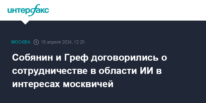 Москва. 18 апреля. INTERFAX.RU - Мэр Москвы Сергей Собянин и президент, председатель правления ПАО "Сбербанк России" Герман Греф подписали соглашение о сотрудничестве между правительством Москвы и Сбером в области искусственного интеллекта, а также дали старт обучению преподавателей московских колледжей в рамках образовательного проекта Сбера "Школа 21".
