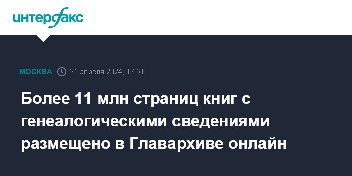 Москва. 21 апреля. INTERFAX.RU - Мэр Москвы Сергей Собянин сообщил о новых возможностях для поиска предков у москвичей: более 11 млн страниц книг, содержащих генеалогические сведения, разместили в онлайн-сервисах Главархива.