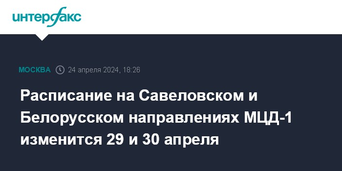 Москва. 24 апреля. INTERFAX.RU - Расписание поездов на Савеловском и Белорусском направлениях первой линии Московских центральных диаметров (МЦД-1, D1) изменится 29 и 30 апреля в утренние часы в связи с проведением работ на станции Марк, сообщили в столичном департаменте транспорта.