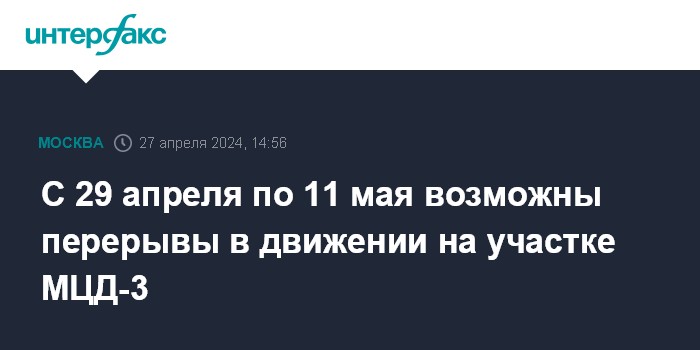 С 29 апреля по 11 мая возможны перерывы в движении на участке МЦД-3