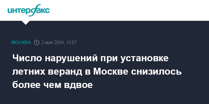 Москва. 2 мая. INTERFAX.RU - Количество нарушений при установке летних веранд в Москве сократилось более чем в два раза, сообщает пресс-служба столичной Госинспекции по недвижимости.
