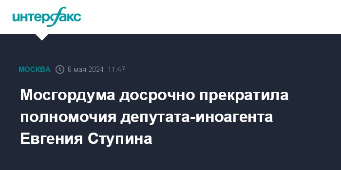 Москва. 8 мая. INTERFAX.RU - Московская городская дума на заседании в среду приняла постановление о досрочном прекращении депутатских полномочий Евгения Ступина, который признан в РФ иностранным агентом.