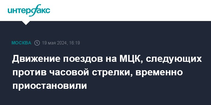 Москва. 19 мая. INTERFAX.RU - На Московском центральном кольце (МЦК) сбой поездов, следующих против часовой стрелки, движение временно приостановлено, сообщила в воскресенье Московская железная дорога (МЖД).