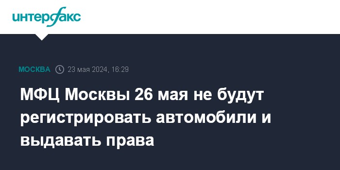 Москва. 23 мая. INTERFAX.RU - 26 мая в воскресенье многофункциональные центры Москвы не будут выдавать водительские удостоверения и регистрировать автомобили в воскресенье в связи с проведением плановых технических работ информационных систем МВД России, сообщили в пресс-службе столичной полиции.