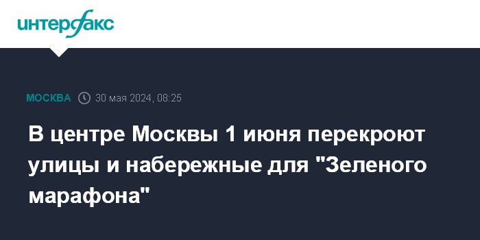 Москва. 30 мая. INTERFAX.RU - В центре Москве 1 июня в первую половину дня несколько улиц и набережных будут перекрывать для движения транспорта ради проведения забега "Зеленый марафон", сообщил городской Департамент транспорта со ссылкой на Центр организации дорожного движения.