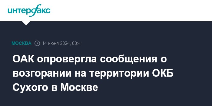 Москва. 14 июня. INTERFAX.RU - В Объединенной авиастроительной корпорации (ОАК) назвали некорректными появившиеся сообщения о возгорании на территории Опытно-конструкторского бюро (ОКБ) Сухого в Москве.