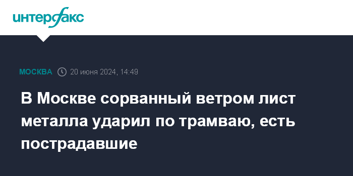 Москва. 20 июня. INTERFAX.RU - Сорванный ветром металлический лист ударил по трамваю на севере Москвы, двое пассажиров получили легкие травмы, сообщили в департаменте транспорта столицы.