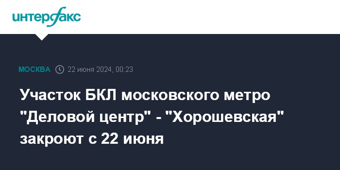 Москва. 22 июня. INTERFAX.RU - Участок Большой кольцевой линии (БКЛ) столичного метро "Деловой центр - Шелепиха - Хорошевская" закроют с 22 июня для интеграции в строящуюся Рублево-Архангельскую линию.
