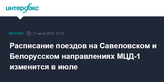 Москва. 27 июня. INTERFAX.RU - Расписание движения поездов на Савеловском и Белорусском направлениях первой линии Московских центральных диаметров (МЦД-1, D1) изменится в июле, сообщили в департаменте транспорта Москвы.