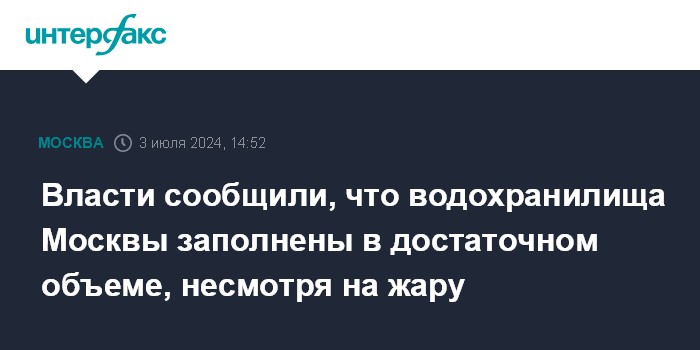 Москва. 3 июля. INTERFAX.RU - Все столичные водохранилища, несмотря на сильную жару в начале июля, заполнены в достаточном объеме для обеспечения бесперебойного водоснабжения города, сообщил заместитель мэра Москвы по вопросам ЖКХ и благоустройства Петр Бирюков.