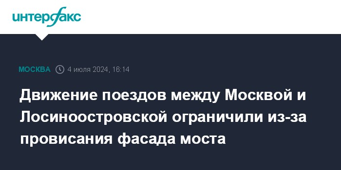 Москва. 4 июля. INTERFAX.RU - На Ярославском направлении Московской железной дороги остановили движение поездов по 5 главному пути на участке Москва - Лосиноостровская из-за провисания фасадной плиты автомобильного путепровода, который проходит над железнодорожными путями, сообщил телеграм-канал МЖД.