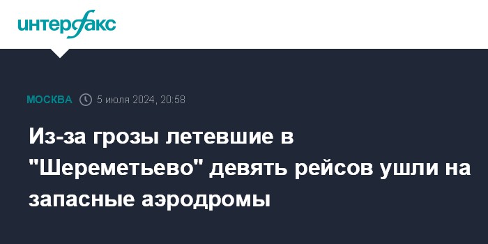 Москва. 5 июля. INTERFAX.RU - Вечером в пятницу из-за грозы девять самолетов, которые должны были сесть в "Шереметьево", ушли на запасные аэродромы, сообщила Росавиация.