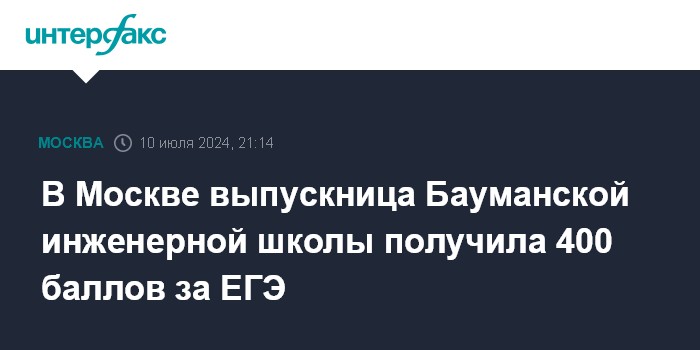 Москва. 10 июля. INTERFAX.RU - В Москве выпускница Бауманской инженерной школы №1580 в Чертанове Северном Александра Оглоблина набрала на ЕГЭ четыреста баллов за четыре предмета - русский язык, профильную математику, физику и информатику, сообщил мэр столицы Сергей Собянин.