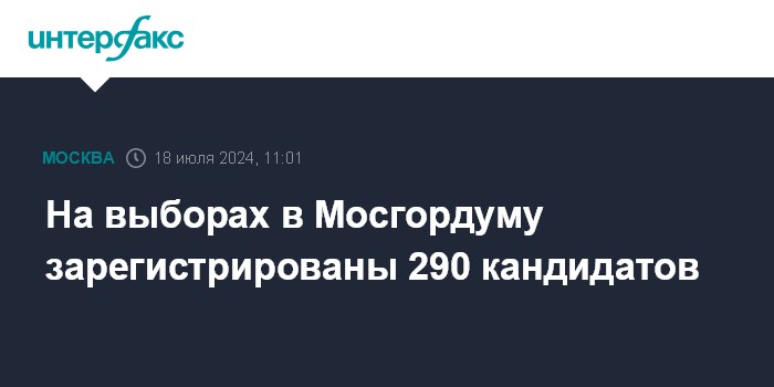 Москва. 18 июля. INTERFAX.RU - Завершилась регистрация кандидатов на выборах в Мосгордуму, зарегистрированы 290 человек, сообщила пресс-служба Мосгоризбиркома.