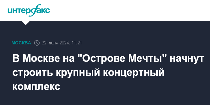 Москва. 22 июля. INTERFAX.RU - В Москве в рамках проекта "Остров мечты" скоро начнут строить концертный комплекс сообщили в пресс-службе градостроительного комплекса столицы.