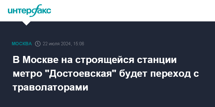 Москва. 22 июля. INTERFAX.RU - Первый в московском метро пешеходный переход с траволаторами появится на строящейся станции "Достоевская" Кольцевой линии, сообщил заммэра столицы по вопросам градостроительной политики и строительства Владимир Ефимов. Его