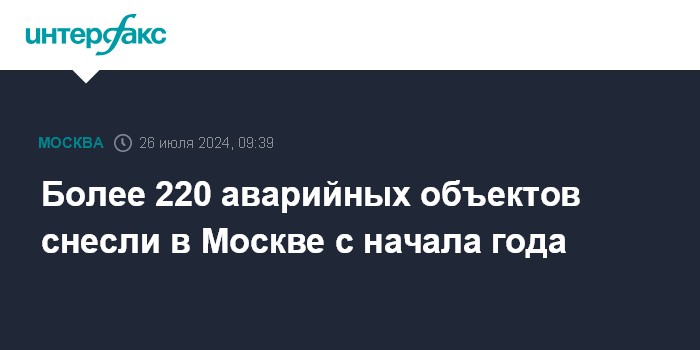 Москва. 26 июля. INTERFAX.RU - Свыше 220 аварийных объектов снесли в Москве за январь-июнь 2024 года, сообщила пресс-служба столичной Госинспекции по недвижимости.