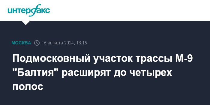 Москва. 15 августа. INTERFAX.RU - После капитального ремонта ширина участка трассы М-9 "Балтия" в Шаховском городском округе Московской области увеличится до четырех полос, сообщили в пресс-службе Главгосэкспертизы России.