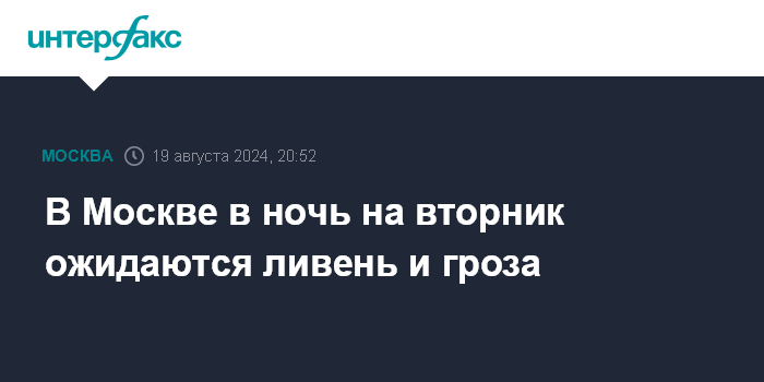 Москва. 19 августа. INTERFAX.RU - В Москве ночью и утром во вторник ожидаются ливень с грозой, предупредил комплекс городского хозяйства.