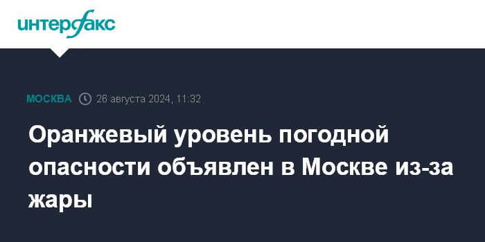 Москва. 26 августа. INTERFAX.RU - Оранжевый, предпоследний, уровень погодной опасности объявлен в Москве из-за жары, следует из данных Гидрометцентра РФ.