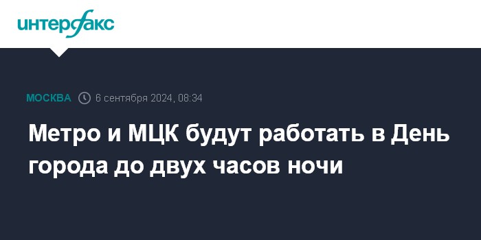 Москва. 6 сентября. INTERFAX.RU - Работу московского транспорта продлят в День города, в ночь с 7 на 8 сентября метро и МЦК будут работать до 02:00, сообщил мэр Москвы Сергей Собянин.