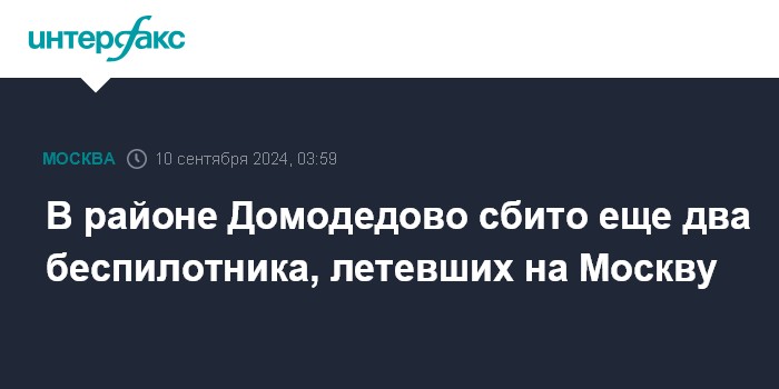 Москва. 10 сентября. INTERFAX.RU - В городском округе Домодедово уничтожено еще два беспилотника, летевших на Москву, написал мэр столицы Сергей Собянин в своем телеграм-канале.