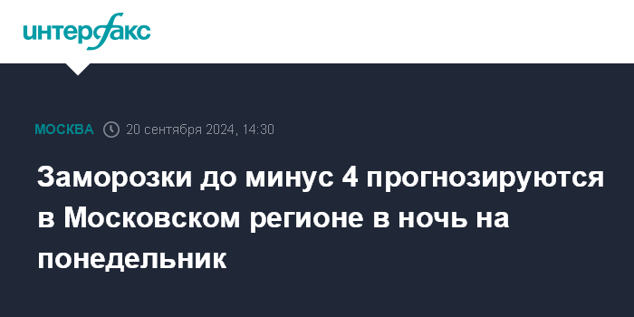 Москва. 20 сентября. INTERFAX.RU - Понижение температуры до нормальных осенних значений прогнозируется в Москве в выходные, первые заморозки в столичном регионе ожидаются в ночь на понедельник, в самой Москве столбики термометров опустятся до ноля, а в Подмосковье температура будет опускаться до минус 4 градусов, сообщил "Интерфаксу" научный руководитель Гидрометцентра России Роман Вильфанд.