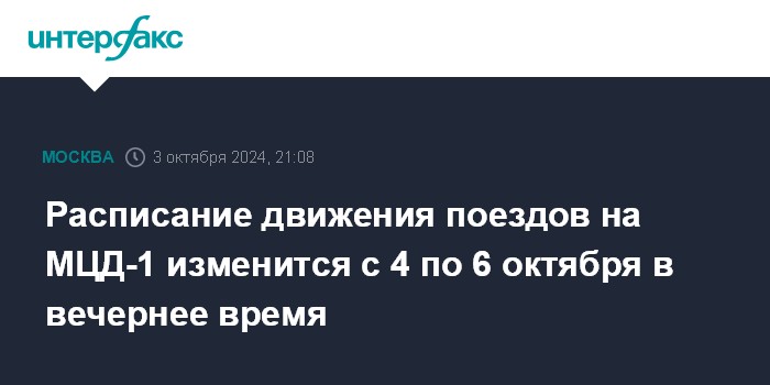 Москва. 3 октября. INTERFAX.RU - Движение поездов на первой линии Московских центральных диаметров (МЦД-1) изменится с 19:00 до 7:30 с 4 на 5 октября и с 5 на 6 октября, сообщили в четверг в столичном департаменте транспорта.