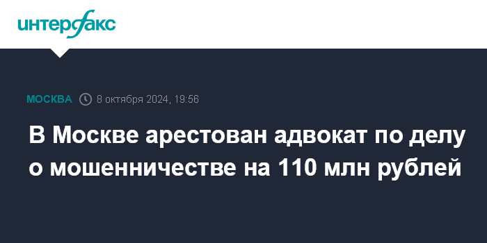 В суде не привели подробностей дела, однако в правоохранительных органах "Интерфаксу" сообщили, что адвокату вменяется мошенническое хищение около 110 млн рублей.