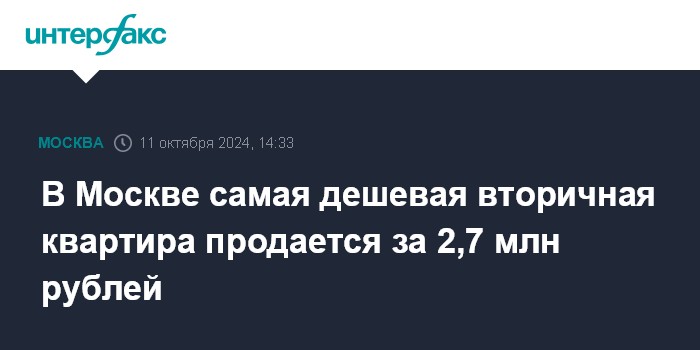 Москва. 11 октября. INTERFAX.RU - В столице на вторичном рынке самая дешевая квартира сейчас стоит 2,7 млн рублей, она находится в новой Москве, выяснили аналитики "Домклик" Сбербанка, изучив объявления о продаже в начале октября.