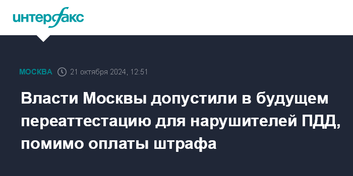 Москва. 21 октября. INTERFAX.RU - Заммэра Москвы по вопросам транспорта Максим Ликсутов не исключил, что в будущем нарушители правил дорожного движения (ПДД), помимо оплаты штрафов, будут проходить переаттестацию на знание правил, эту практику успешно применяют в некоторых городах мира.
