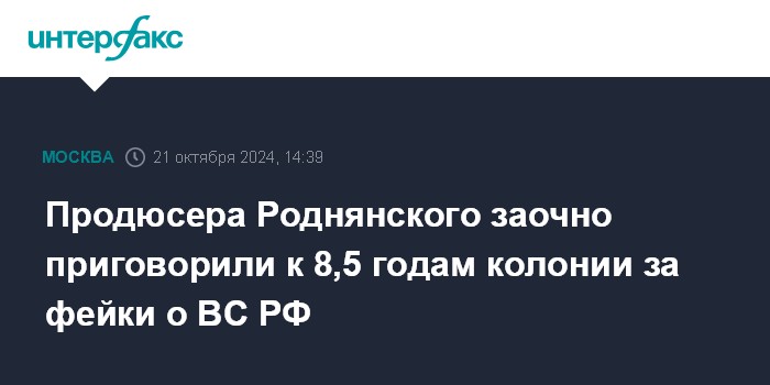 Москва. 21 октября. INTERFAX.RU - Басманный суд Москвы заочно приговорил к восьми с половиной годам колонии общего режима украинского продюсера и медиаменеджера Александра Роднянского (признан в РФ иноагентом) по делу о распространении ложной информации про действия Вооруженных сил РФ, сообщили "Интерфаксу" в суде в понедельник.