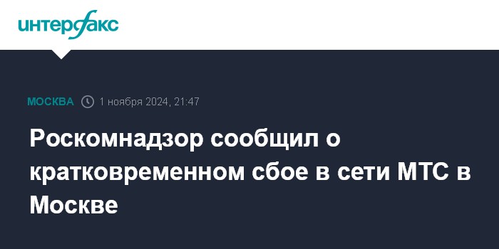 Москва. 1 ноября. INTERFAX.RU - Кратковременный сбой в сети МТС, который затронул пользователей фиксированного интернет-доступа, устранен, сообщила пресс-служба Роскомнадзора (РКН).