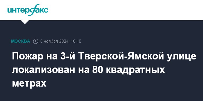 Москва. 6 ноября. INTERFAX.RU - В центре Москвы пожар в жилом доме на 3-й Тверской-Ямской улице локализован на площади 80 квадратных метров, сообщили в МЧС столицы. Пострадавших нет.